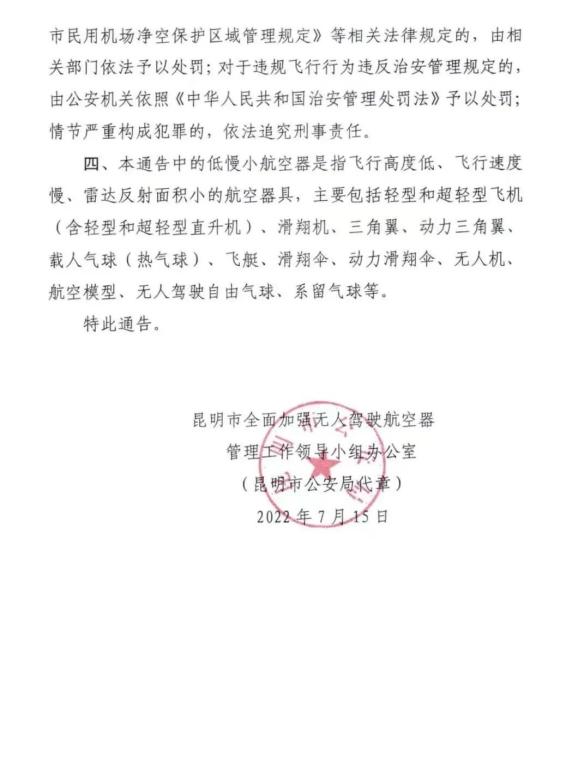 注意!7月22日至24日,昆明这些区域禁飞无人机