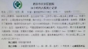 西安市长安区医院死亡记录显示,死亡诊断为多脏器功能衰竭、热射病。