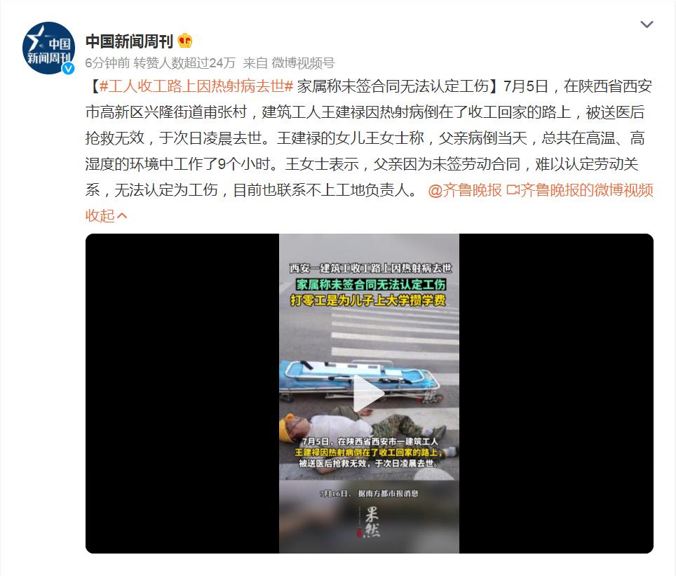 7月5日,陕西省西安市一名建筑工人在收工回家的路上晕倒,随后被送医后抢救无效,于次日凌晨去世。