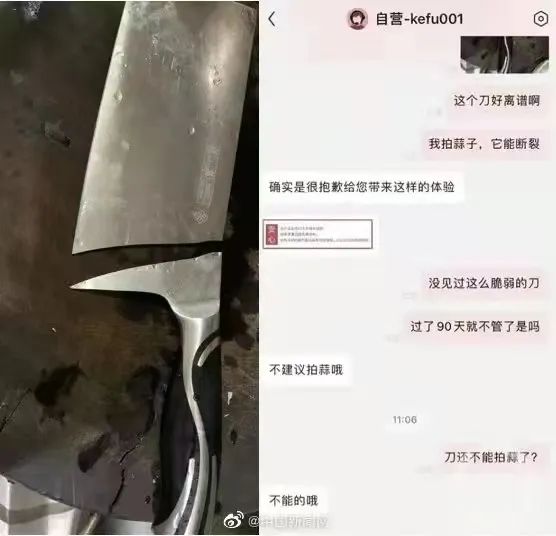 先是生产的刀具在拍蒜时断裂,张小泉的客服却回应说刀的设计导致菜刀不能拍蒜。