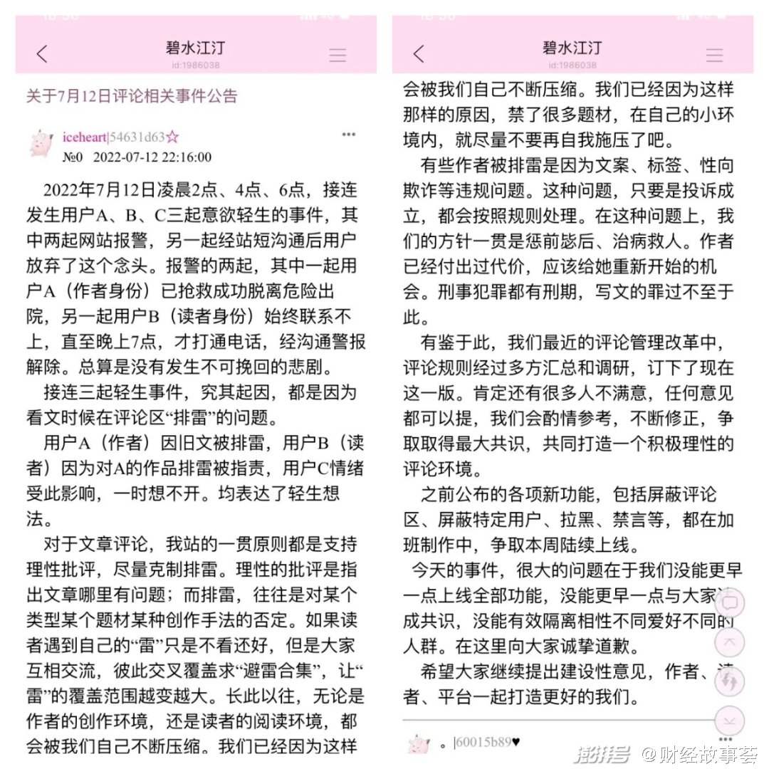 7月13日至7月16日,晋江的部分读者因不满平台排雷新规,以及一些作者的偏激言论,发起反击,一时“碧水江汀”和“读书心得区”出现对立局面,甚至有读者扬言轻生,好在平台报警并确认平安。