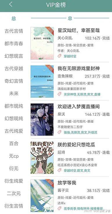 打开晋江VIP金榜,确实可以看到,在告别了传统文学叙事之后,商业化的轻松小白文更受读者欢迎,除了关心则乱这样的知名作者靠《星汉灿烂,幸甚至哉》的IP改编占据榜一位置,其他作品多为穿书、穿越类的爽文。