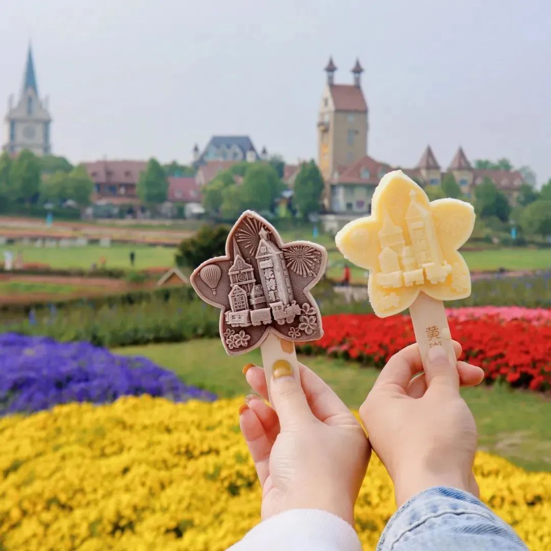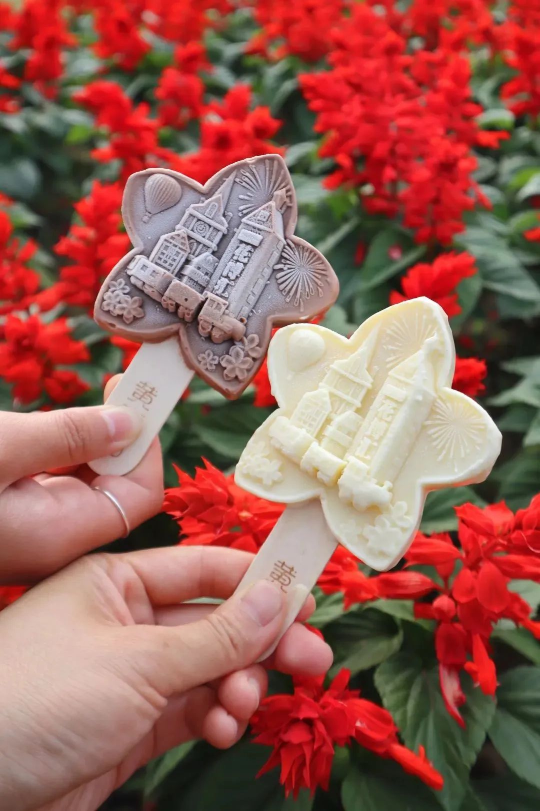 蔡甸花博汇景区的文创雪糕以花朵为形,融合了钟楼、教堂、火车、热气球、烟花等最具代表性的元素,有轻牛乳味和巧克力味两种口味,轻轻咬上一口,口感绵密、奶香浓郁。