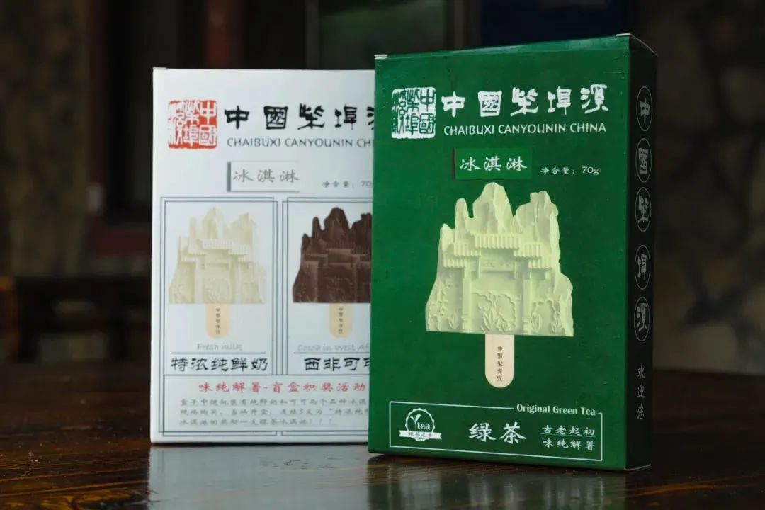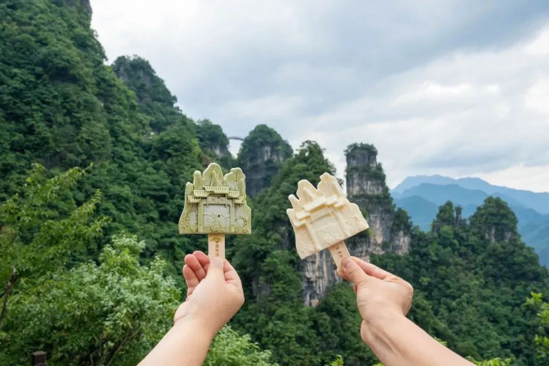 柴埠溪推出的文创雪糕,选取了景区大门、三姊妹峰、对嘴石三处经典景观。古老的大门作雕花点缀,驻立在大门之上的地标景点对嘴石、三姊妹峰栩栩如生,整体设计突出山地自然环境,展现原生态风光之美。