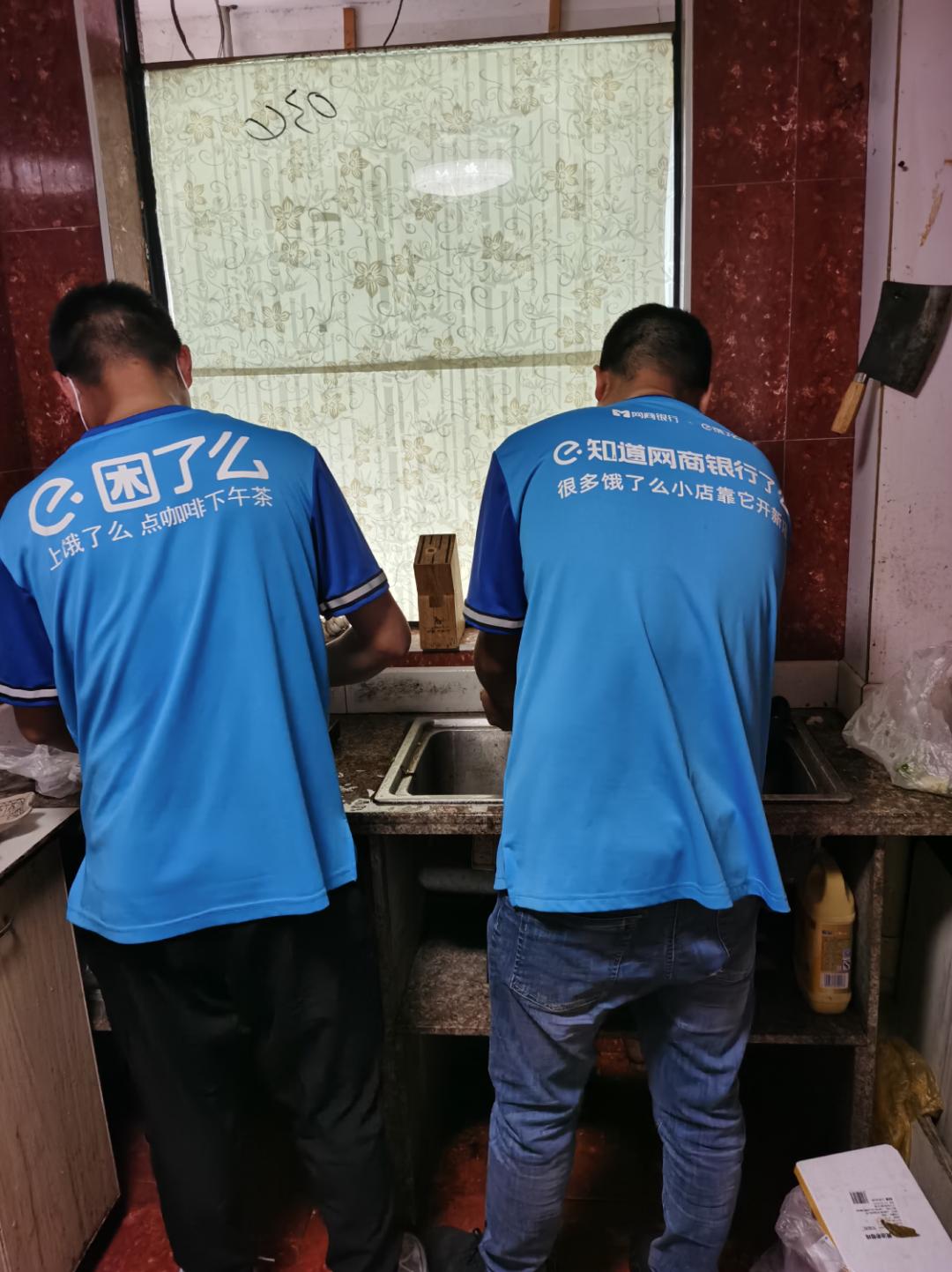 哥俩特别有意思,个头差不多,都穿着饿了么的短袖T恤,一个后背上写着“知道网商银行了么,很多饿了么小店靠它开新店。”另一个是“困了么,上饿了么点咖啡下午茶。”