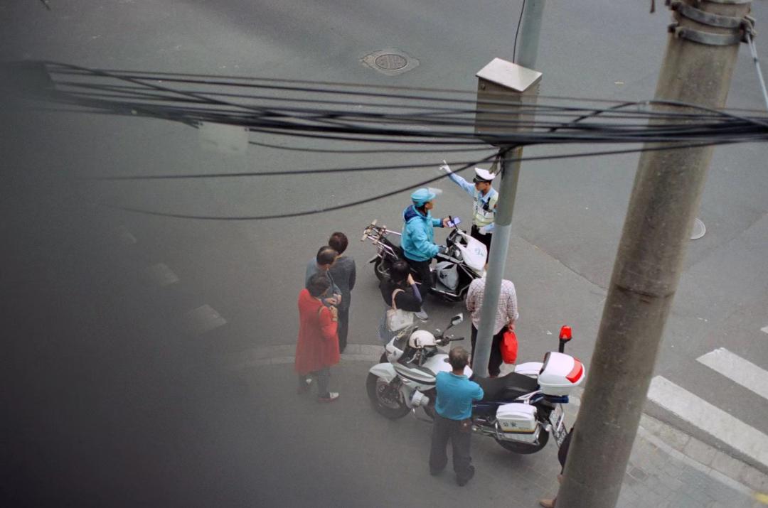 ▲一位外卖小哥正在和交警交涉 摄影:丝绒陨