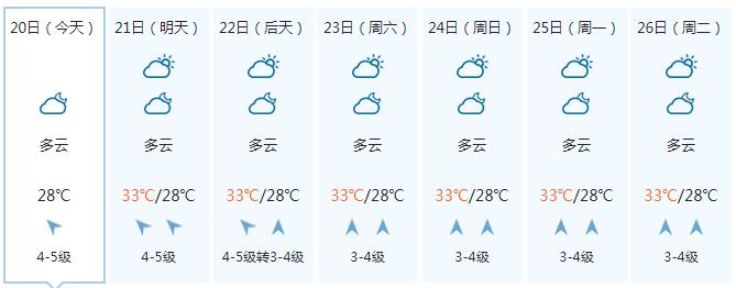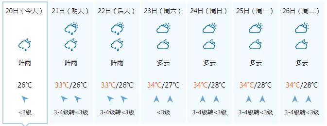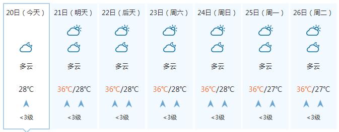 南宁市:今天晚上多云,明天白天多云、局地有阵雨或雷雨,偏南风2到3级,最低气温26℃,最高气温34℃。