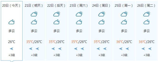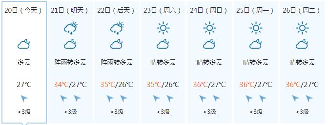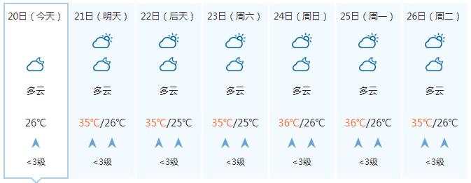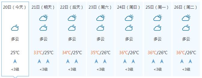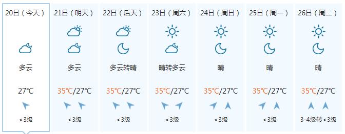 23日,全区多云到晴,其中沿海部分地区有阵雨或雷雨。全区大部最高气温35~37℃、局地38℃以上。