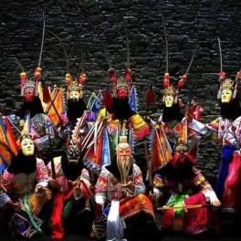 在这里,你还可以观看精彩的地戏表演。地戏,是流行于贵州省安顺市的地方戏,是屯堡人独有的一种头戴木刻假面的传统民间戏剧。其产生于明初,来自安徽、江苏、江西、浙江、河南等地的屯军。