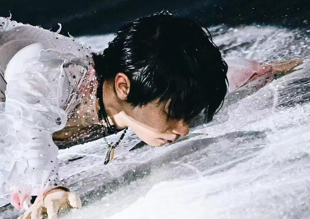 当时羽生结弦侧卧着,身体因疼痛而蜷曲,伤口流出的血也顺着额头流到了脖子上,直接将冰面染红。