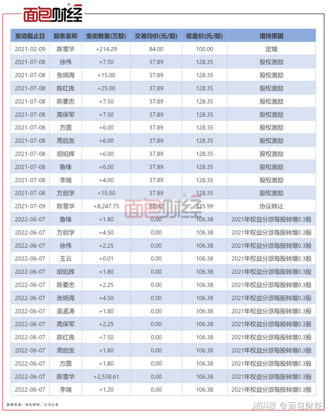 此外,根据2021年利润分配方案,至2022年6月末,陈雪华及多名公司高管完成每股转增后,合计持有公司股份2572.07万股。