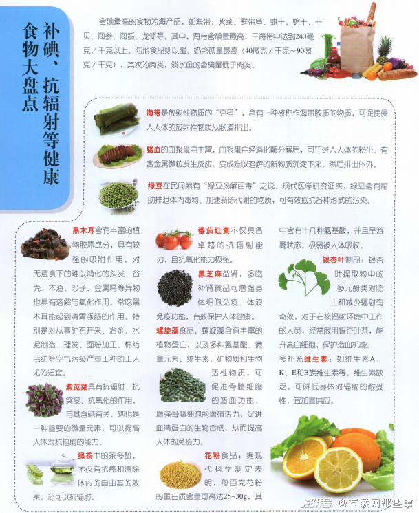要说防辐射食品,擅长朋克养生的年轻人自觉接过了当年父母一辈在“相亲相爱一家人”里分享震惊体的大旗,先发制人,总结了一套又一套的防辐射食疗大法。