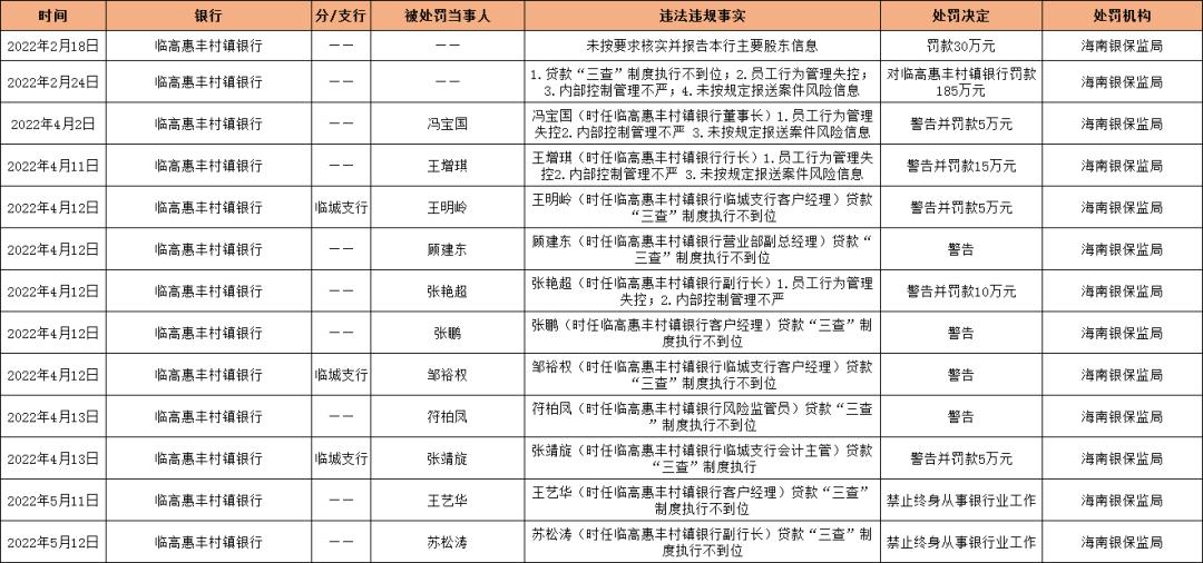随后,2月24日,因贷款“三查”制度执行不到位、员工行为管理失控、内部控制管理不严、未按规定报送案件风险信息等问题,临高惠丰村镇银行被海南银保监局罚款185万元。