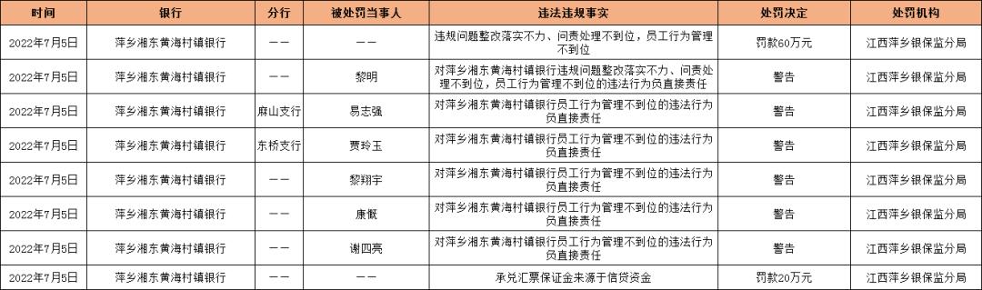 图片来源:中国银保监会官网截图另外,萍乡湘东黄海村镇银行的6名员工均被予以警告处罚。