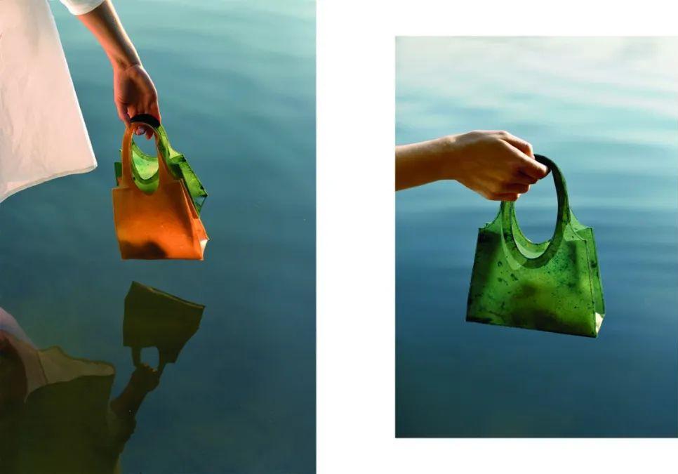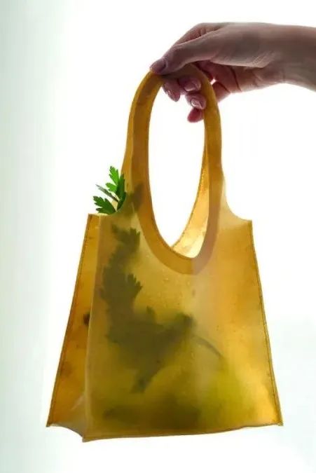 柏林设计师 Lobke Beckfeld 和 Johanna Hehemeyer-Cürten 开发了一种半透明的水果皮手袋:Sonnet155这个手袋可以溶于水中进行自然降解,甚至可以用来给植物施肥,使用寿命接近于一次性的普通纸袋。