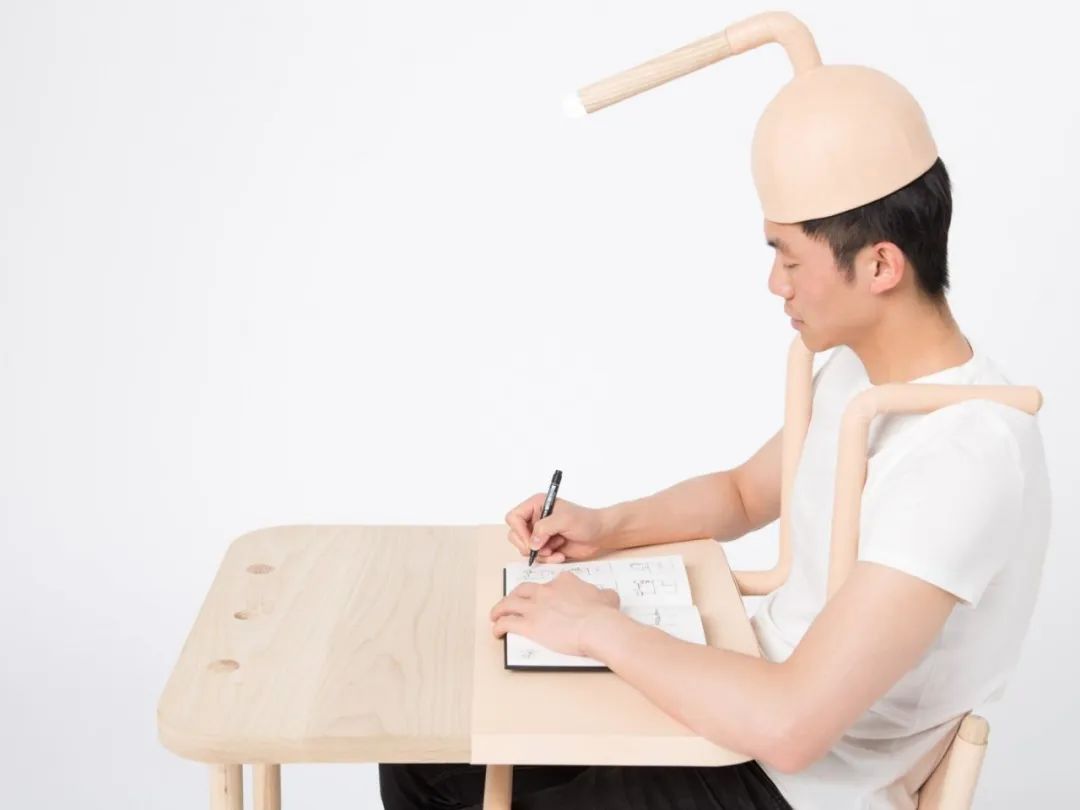 中国设计师官详设计了一套特别的家具,包括一张没有支撑就无法立起来的桌子、一把不坐上去就没法支撑的椅子以及一盏只有戴到头上才会亮起的灯。这个的设计旨在鼓励使用者重新思考与自己的家具之间的关系。