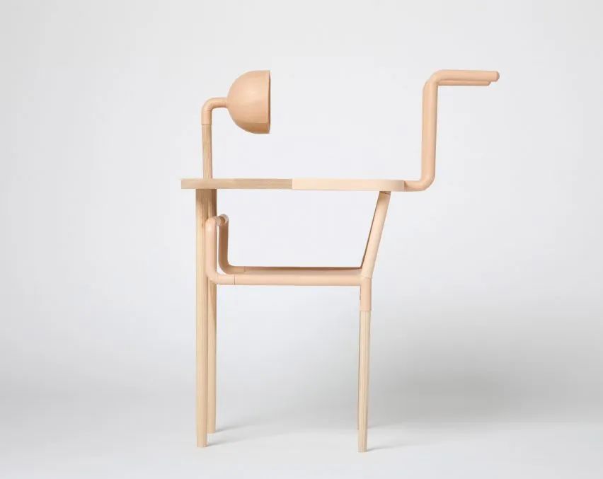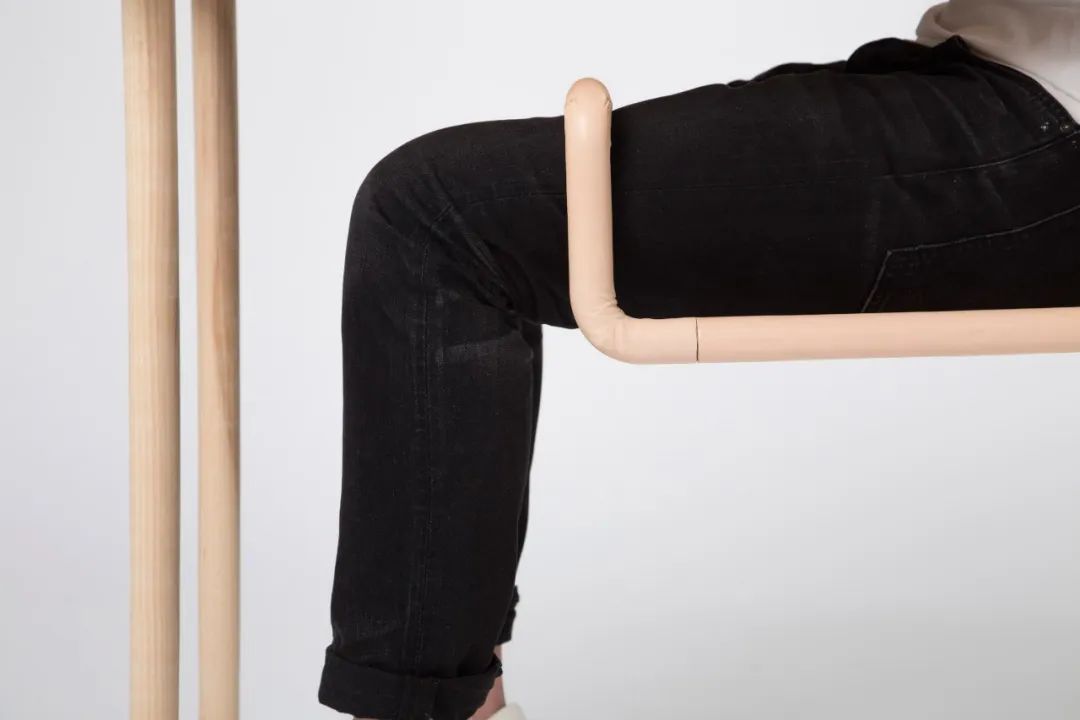 桌椅只有两条腿,使用这件家具还真不是一个容易的事。比如当你没有坐在椅子上时,它就会掉到地上,你还需要弯一点腰来作支撑,你的身体也就成了椅子的一部分。