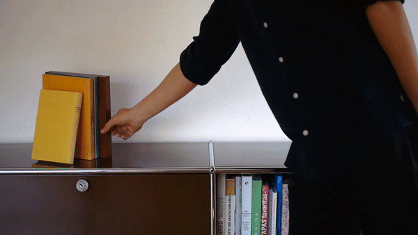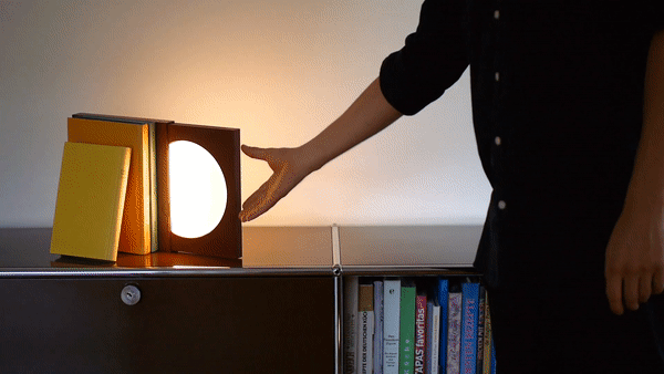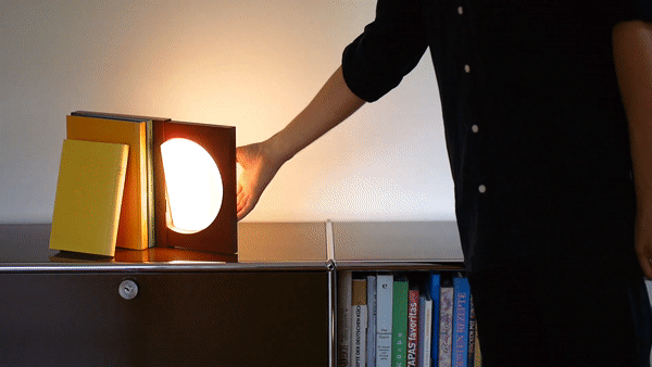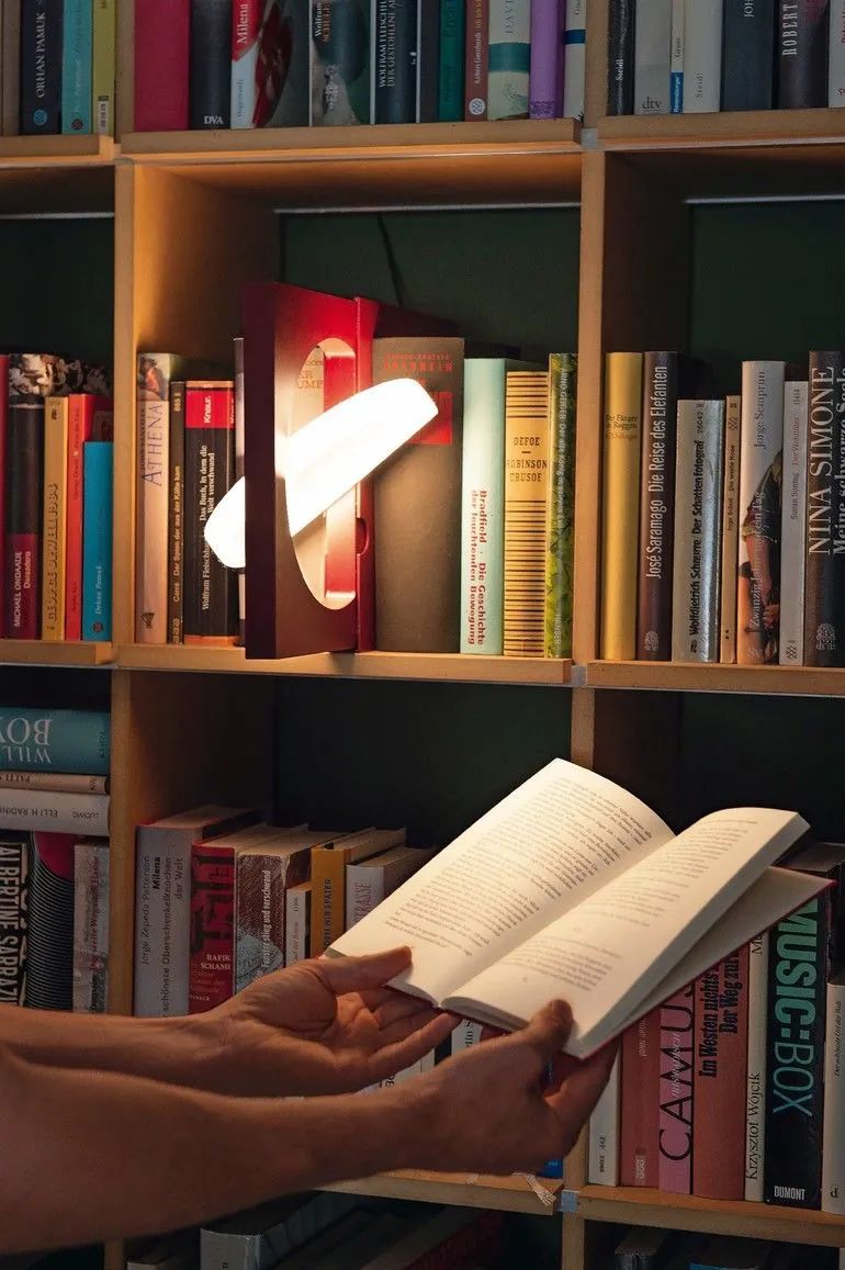 它像一本红色封皮的经典书般直立在书架上,如果慢慢拉出来,里面的圆盘就会开始发光,并越来越多地照亮周围的书籍。