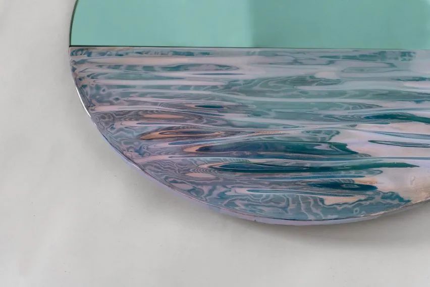 圆镜子上的玻璃陶瓷片采用手工上釉,在不同的烧制温度下烘烤,在最后的质感上能产生丰富的细微差别。