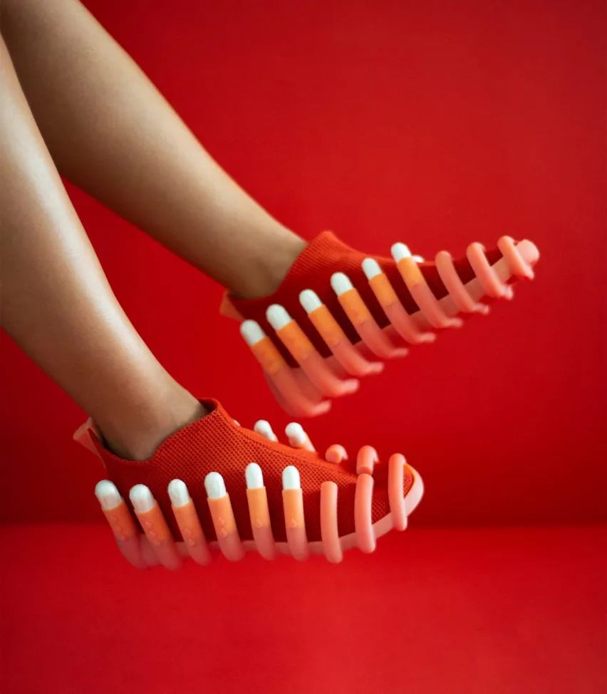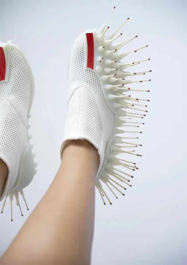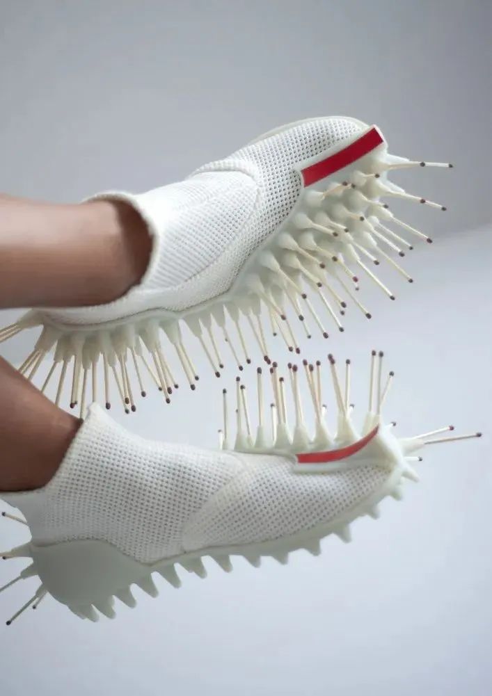 以色利设计师 Netha Goldberg 用卫生棉条、火柴和USB充电插头做成的针织鞋,之所以设计这样的款式,是为了让穿着者在旅途中能给别人提供帮助。Netina 针织鞋系列由三种设计组成,每一种都是安装的材质都是有不同的用途。