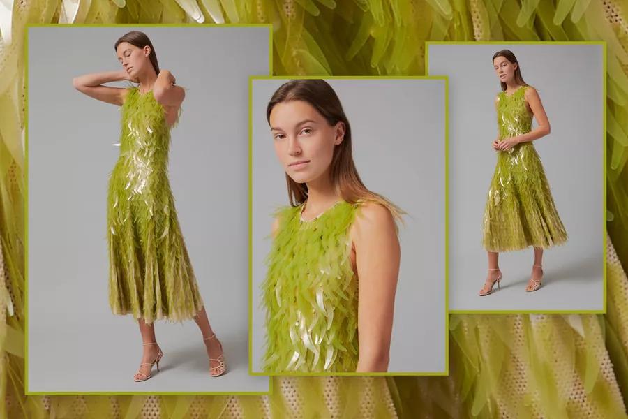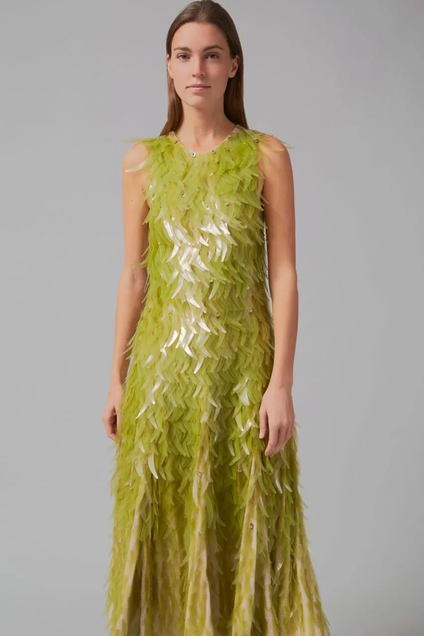 这种藻类亮片不含合成纤维、染料和塑料亮片等原油衍生物,两人将其进行应用,取代普通塑料产品,并保持传统亮片的光泽和硬度。亮片被剪裁成轻微弯曲形状,沿着 A 字连衣裙的营造出波纹效果,加上半透明、空灵的矿物绿色,让人联想到海藻。