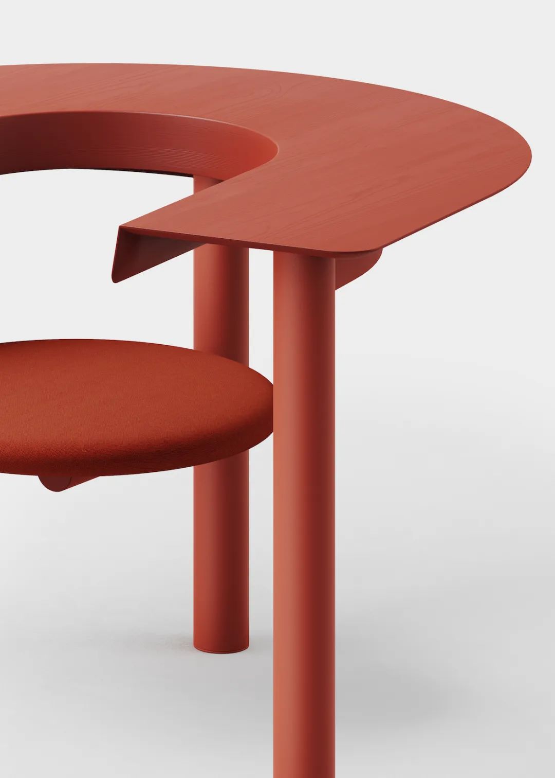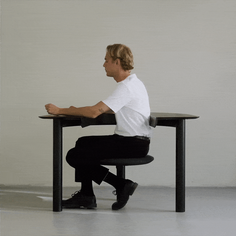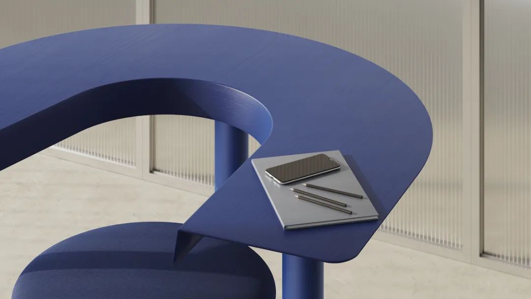 旋转到相反的方向,把桌子作为一个靠背和扶手,这个设计在办公之外具备了更多用途。当人坐下时,桌椅的各个方面都能自由运动,通过不一样的角度,将一个私密的办公空间对外开放,反之亦然。