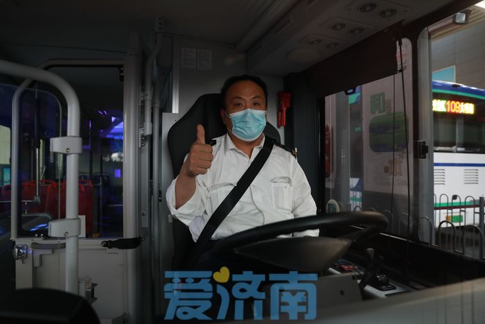 有着26年驾龄的公交驾驶员刘庆年驾驶首辆公交车出站,他说:“很高兴,很激动。”