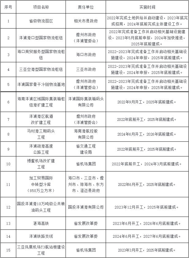 17.增加物流供给。加快港口、机场、铁路、高速公路等重大交通基础设施建设。(省交通运输厅、省发展改革委、相关市县政府按职责分工负责)在农产品集聚区、大型渔港、销地批发市场加快建设冷库及农产品集散集配中心,“十四五”时期,全省新建田头预冷库28万㎥、渔港冷库36万㎥、农产品产地集散中心冷库4万㎥。(责任单位:各市县政府)2024年,建成海口南站、儋州站、东方站和天涯站四大铁路冷库片区。(海南铁路有限公司、相关市县政府按职责分工负责)加快推广使用专业冷藏车,2025年全省保有量达到约3000辆。(责任单位:各市县政府)2023年,在海口港马村港区二期建设滚装运输泊位(兼顾危险品运输)。(责任单位:澄迈县政府)