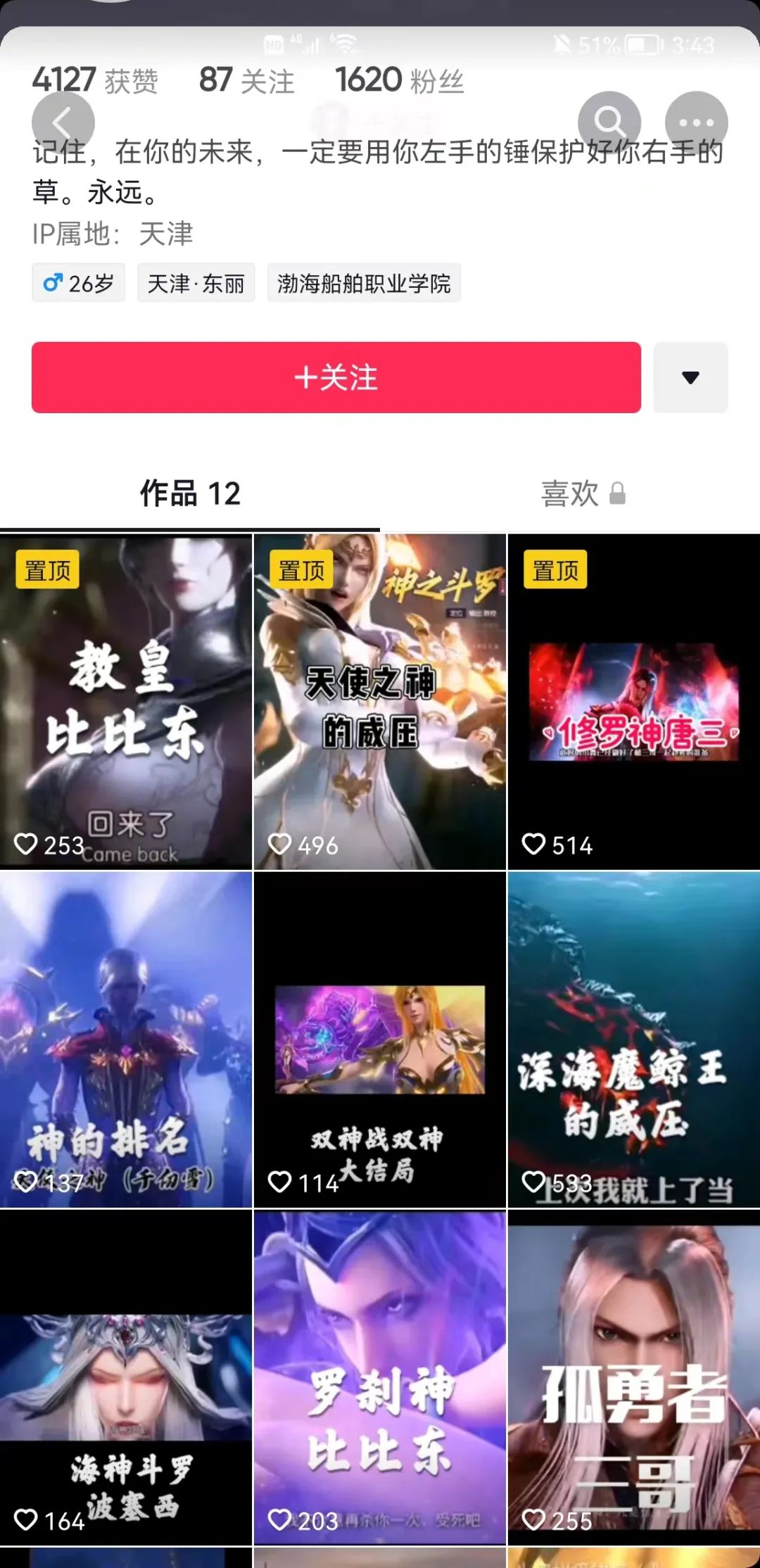 小熊主要在B站发一些CP或者角色混剪,她认为自己的视频定位更适合在B站投放,目前还没有开通抖音账号。