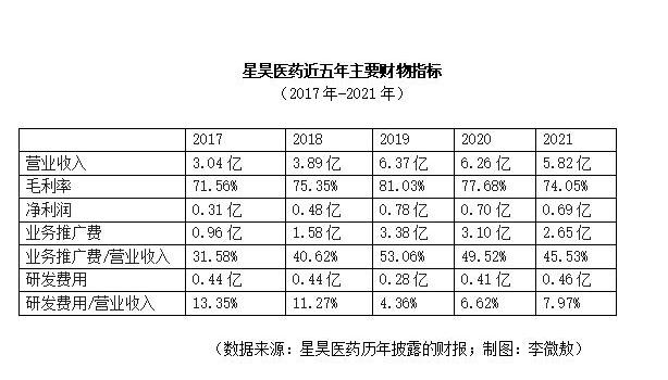 根据星昊医药历年披露的财报,该公司毛利率颇高,2017年至2021年,每年都在70%以上,2019年甚至超过了81%。营业收入也从2017年的3.04亿元,一度上升到2019年的6.37亿元,2021年则为5.82亿元。但是净利润始终在千万元水平,2019年最高时为0.78亿元,2021年则为0.69亿元。