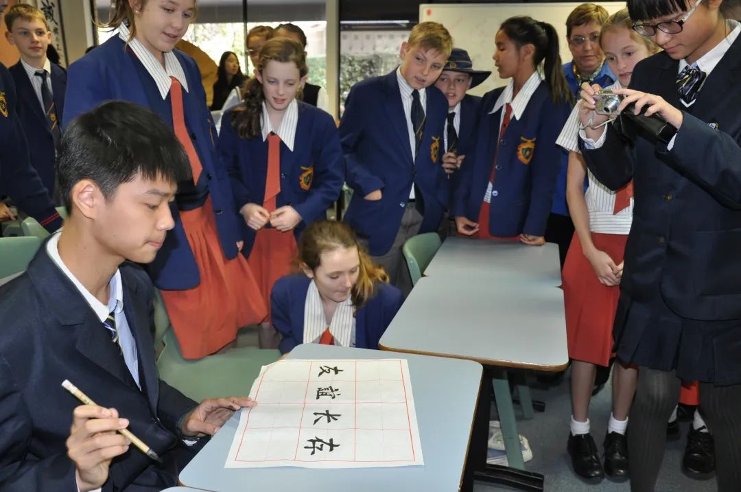 甘外学生教澳洲学生写书法(资料图片)学校以“外语+特色”课程提升文化内涵,近年来开设了“一节(樱花节)、一秀(达人秀)、一社团”、多语国家文化节、经营管理课程、慈善课程、《君子养成》国学课程、南京爱国之旅等课程,开展创智小院士、小研究员评选、全球“环球自然日”比赛、德国Teutolab实验室活动等创新实践,提高了学生的外语综合运用能力和创新能力。