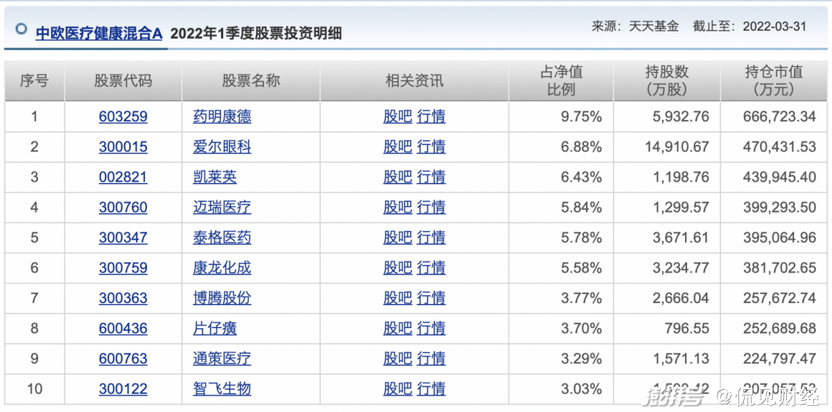 从基金的持仓来看,葛兰偏好于一些大市值个股,且都是以长期持有为主,不经常操作。以中欧医疗健康混合基金为例。在2021年一季度时,该基金的前五大持仓分别为药明康德、爱尔眼科、长春高新、凯莱英以及智飞生物,而到了2022年一季度,该基金的前五大持仓分别为药明康德、爱尔眼科、凯莱英、迈瑞医疗以及泰格医药,前五大持仓中有三只个股并没有发生变化。