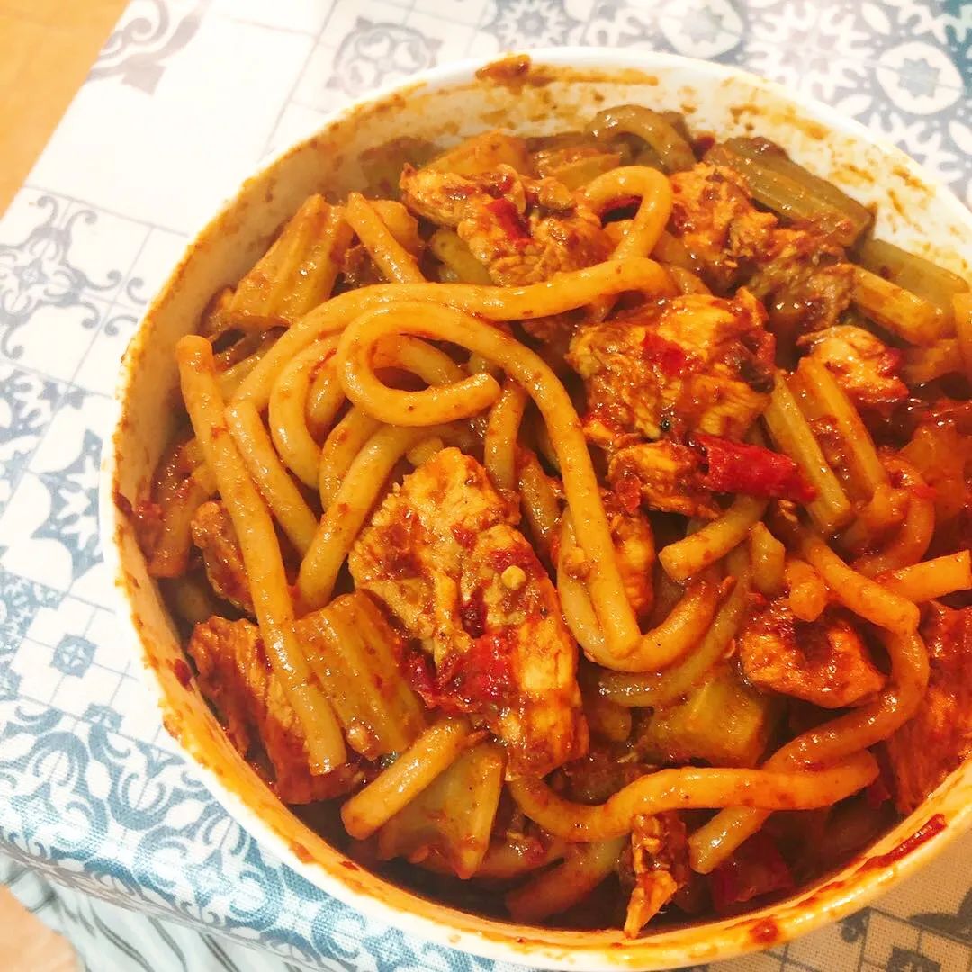 这么粗又很劲道的粉,一定很不容易入味吧。但看到新疆炒米粉的酱料时,你一定会觉得担心是多余的。就像吃辣子鸡一样,第一次吃新疆炒米粉的我,怀疑是点了一碗酱而附送了米粉。