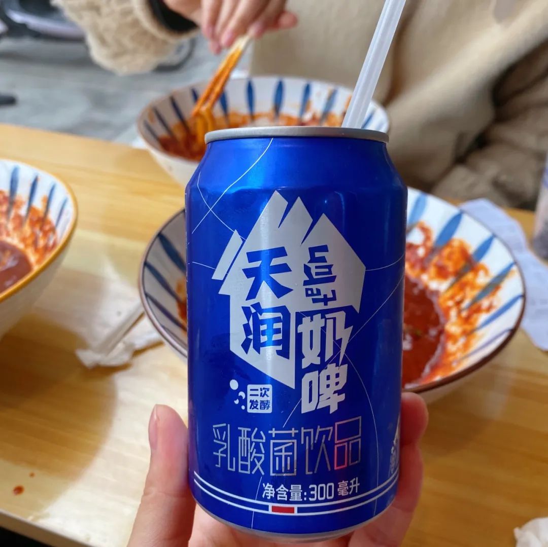 吃到这里,相信你已经满脸潮红。吃串串香解辣靠唯怡豆奶,吃新疆炒米粉也有它专属的解辣cp——奶啤。虽然叫做奶啤,但是非奶非啤,是大新疆的可尔必思。一口干下去之后,方可继续再战!