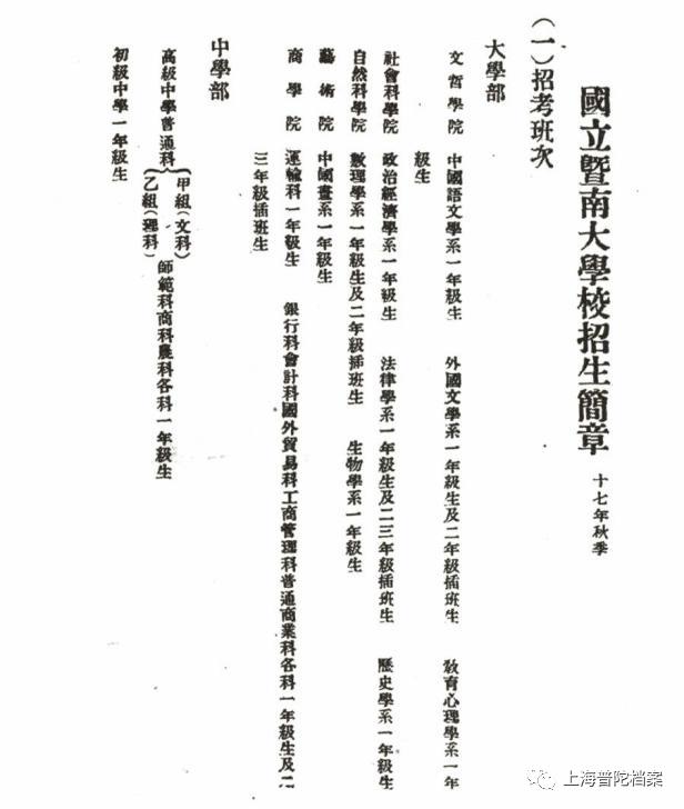 1928年国立暨南大学招生简章暨南大学于当年秋季开始招生,至1930年,除原有的商学院之外,已成立了文学院、理学院、教育学院、法学院,并延聘了一批优秀的教员。