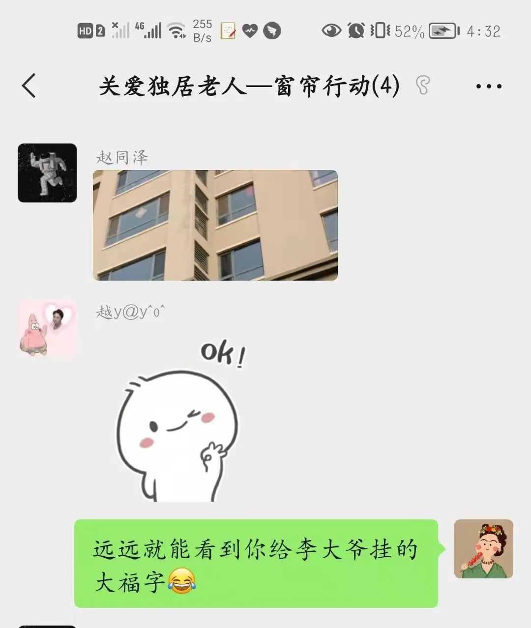 “今天晚上李大爷家没有开灯,不知道什么情况。”志愿者在工作群中反馈。社工马上电话联系李大爷,得知其安全后才放下心并在群内回应。被关注的老人心里有了依靠,志愿者心中有了牵挂,这样看似简单的守护,却给邻里之间带来了无尽的温暖与感动。