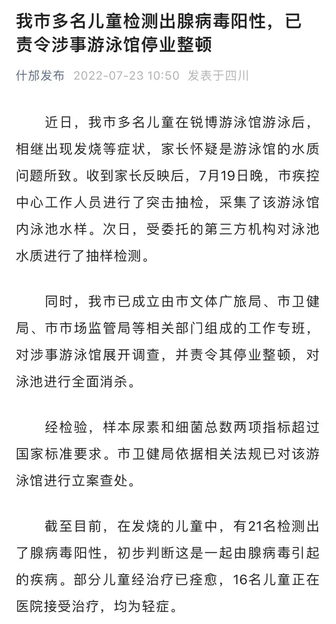 近日,四川省什邡市多名儿童在锐博游泳馆游泳后,相继出现发烧等症状,家长怀疑是游泳馆的水质问题所致。收到家长反映后,7月19日晚,什邡市疾控中心工作人员进行了突击抽检,采集了该游泳馆内泳池水样。次日,受委托的第三方机构对泳池水质进行了抽样检测。