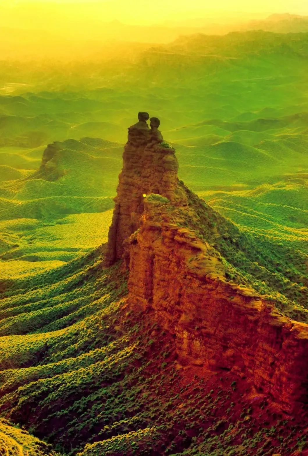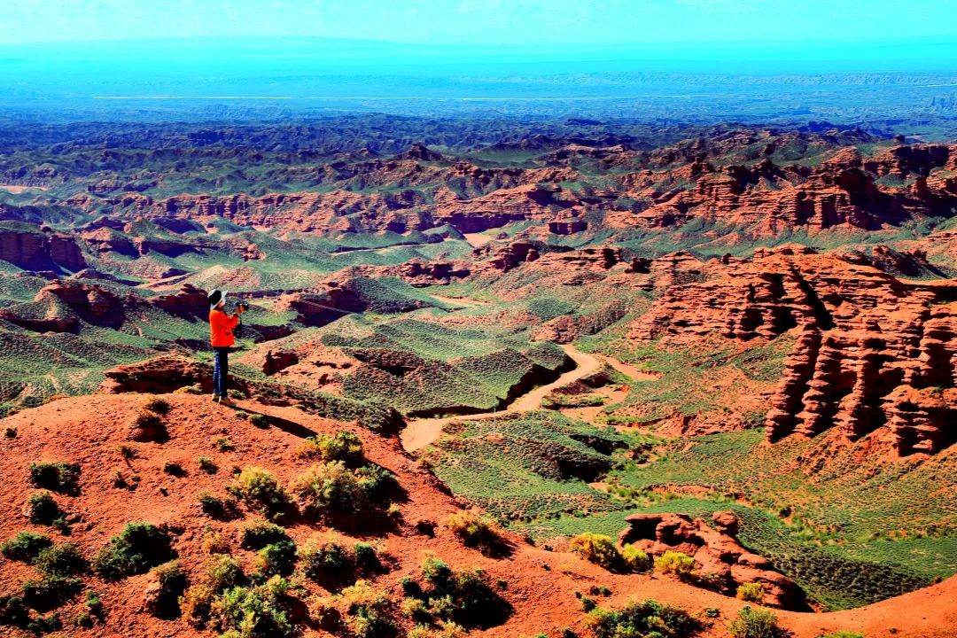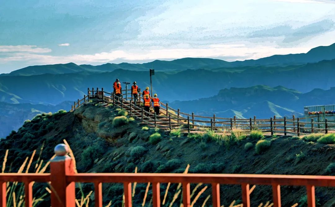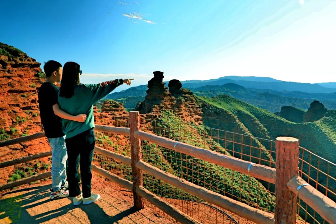 随着相机的镜头对张掖平山湖大峡谷登高眺望,目力所及,感觉有数不胜数的红色的飘带紧贴在连绵起伏的山丘上,宛若是一个脉脉温情的女子依偎在自己深爱着的情侣宽广有力的胸怀里,让眼前这蓝天、白云、山峦、峡谷都来见证他们千百万年来忠贞的爱情。而他们似乎一直厮守在这世外桃源般的仙境,独守属于自己的宁静与安详。让每一位不期而遇的游客都醉美在这里,让现实从每个人的脚下都延伸成美妙的梦境……无论是大峡谷的重要景点情侣峰、神龟问寿,还是远处工作的人、游客,在赵鸿秀老师的镜头下,与整个峡谷相互映衬,在蓝蓝的天空下,都显得格外的生动。
