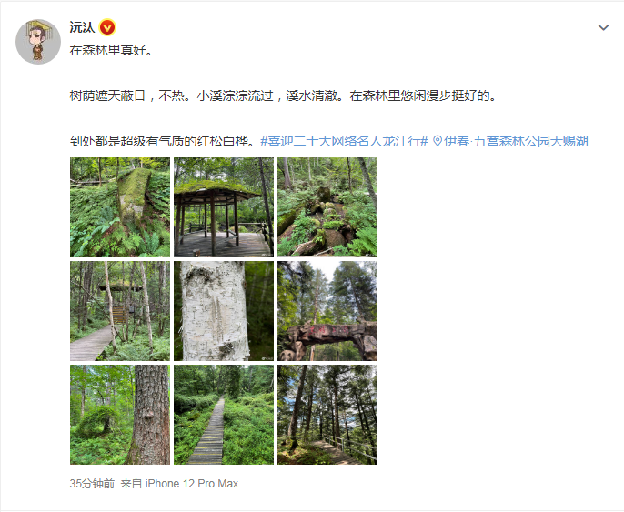 “在森林里真好。树荫遮天蔽日,不热。小溪淙淙流过,溪水清澈。在森林里悠闲漫步挺好的。到处都是超级有气质的红松白桦。”——@沅汰