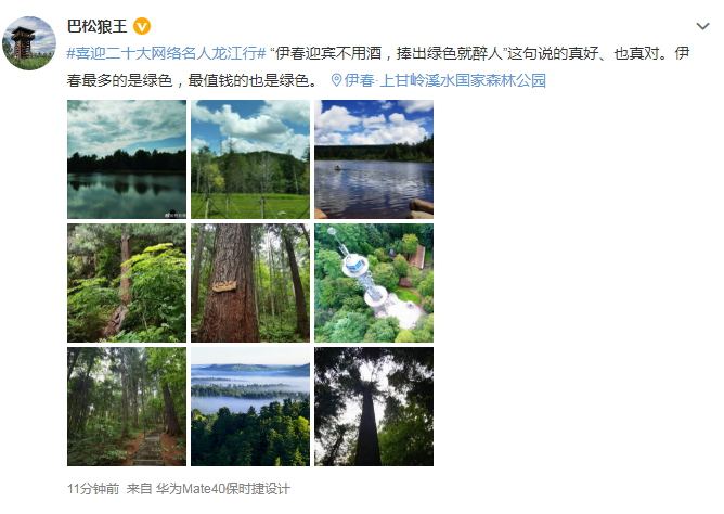 “ ‘伊春迎宾不用酒,捧出绿色就醉人’这句说的真好、也真对。伊春最多的是绿色,最值钱的也是绿色。”——@巴松狼王