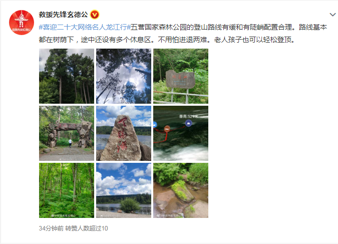 “环境优美,空气清新,偶遇花栗鼠,旁观嗑瓜子。听闻‘木抱石’,初尝松针味。这里是五营国家森林公园。等你来!”——@三剑客