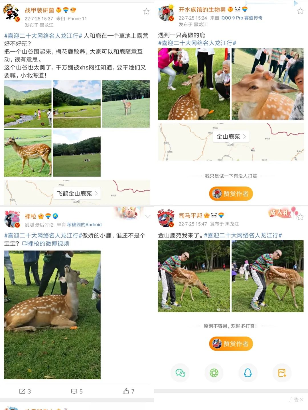 “喂了也摸了,合影了也对视了。看到了鹿鹿的大长卷眼睫毛,最主要是它们基本上不怕人,甚至会主动靠过来,给你喂它的机会。只能说,当地生态是很好了,真正的人与自然和谐相处!”——@三剑客