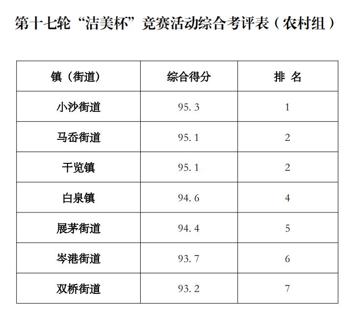 城东街道再次获得第一名,普陀山镇位列第二,朱家尖街道位列第三,均为“洁美杯”城区组优胜单位。“洁美杯”农村组优胜单位前三名分别被小沙街道、马岙街道、干览镇夺得。