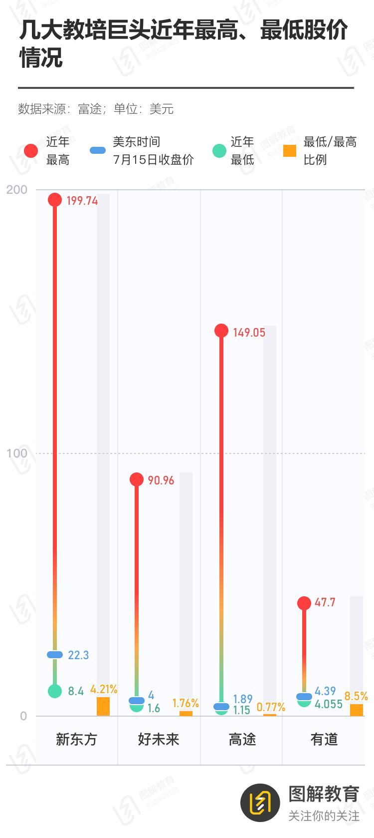及至现在,美东时间7月15日收盘价显示,新东方、好未来股价已有所攀升,均为最低价的2倍多,但高途、有道依然还在谷底徘徊,与最低价相差无几。