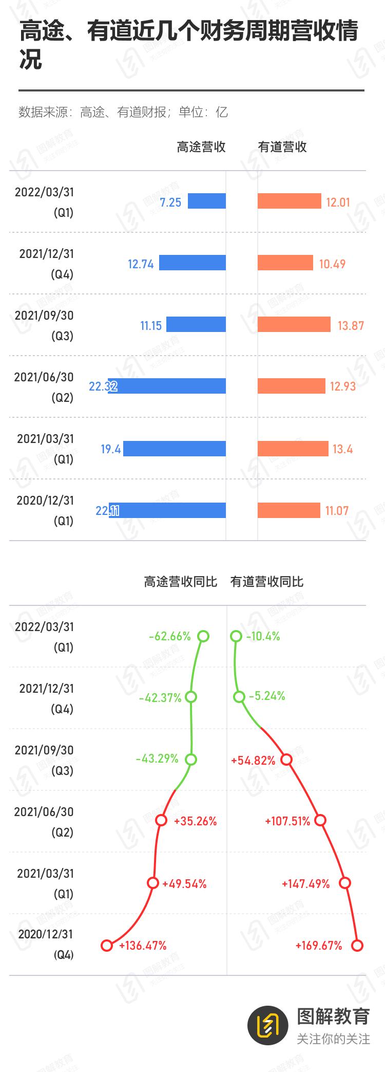 股价急挫后,随之而来的是营收腰斩、同比大幅下滑。在双减公布的(Q3)2021/09/30财务周期里,高途营收直跌至不足上一季度的一半,同比也下滑超过4成,有道的影响也虽迟必到,(Q4)2021/12/31财务周期营收减少,同比开始下滑。