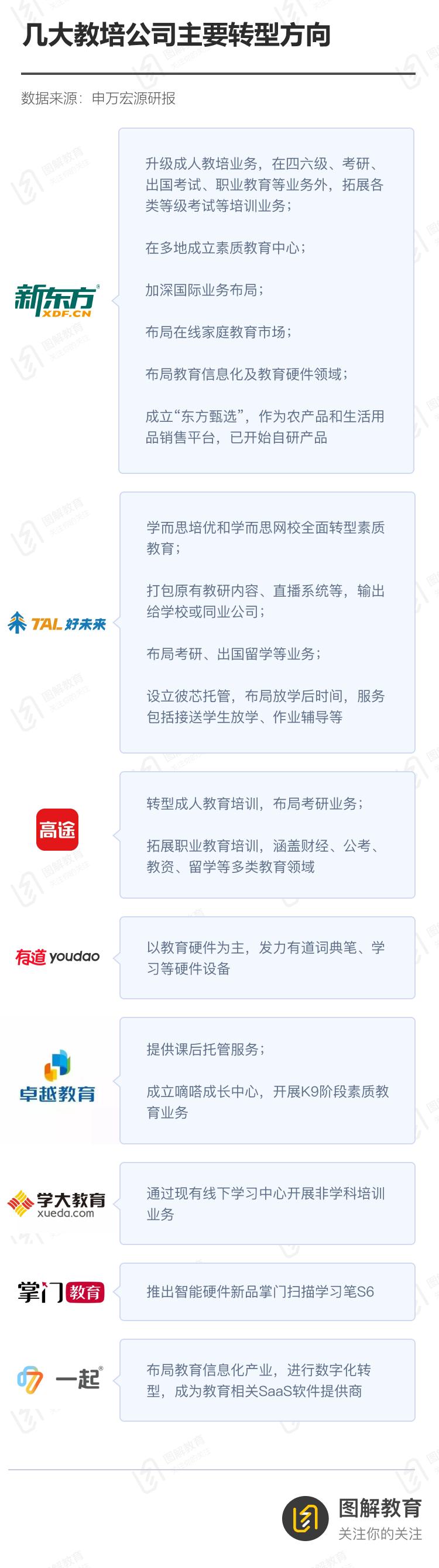 酸辣手裁员的同时,即使眼泪再酸楚、心里再舍不得,痛苦的转型也是不得不为之举,而转型方向基本上集中在成人教育、素质教育、教育信息化等领域。