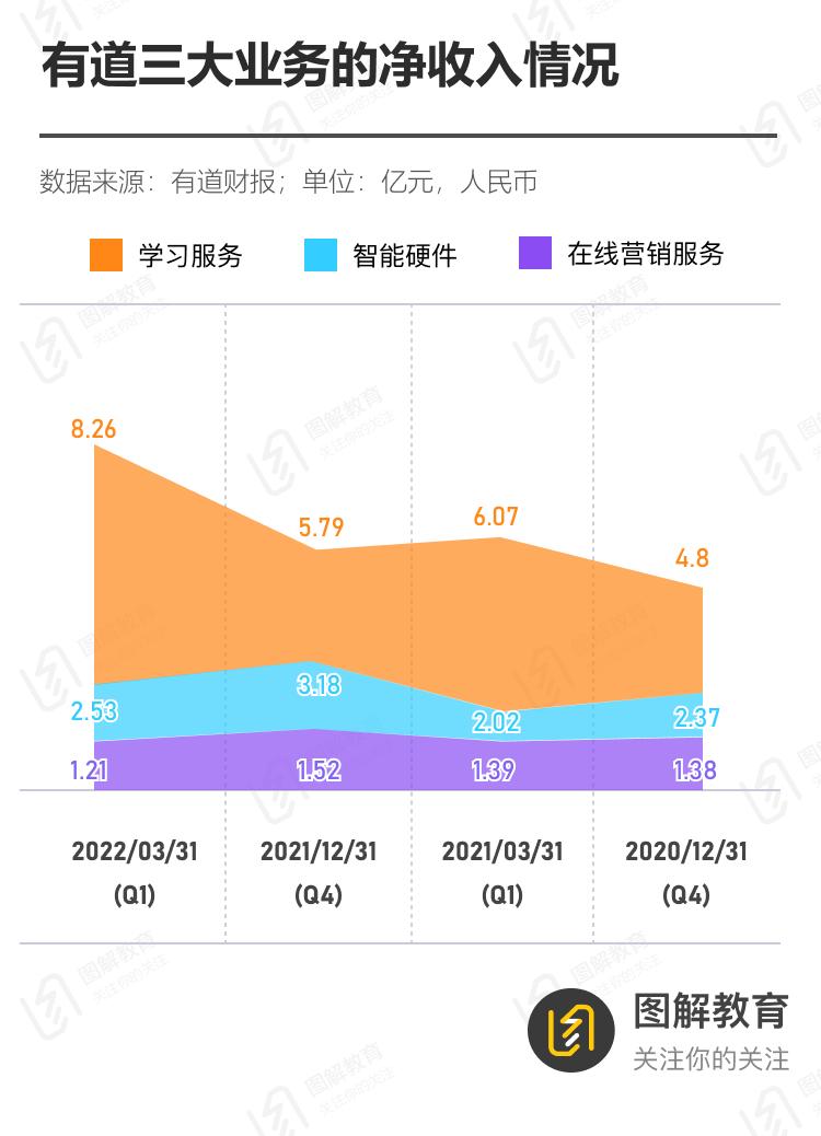 其中,双减前K12业务占比相比较小的有道,受到的阵痛似乎并不太大。依靠学习服务、智能硬件业务净收入的稳步增长,有道的季度营收已几乎恢复到双减前。