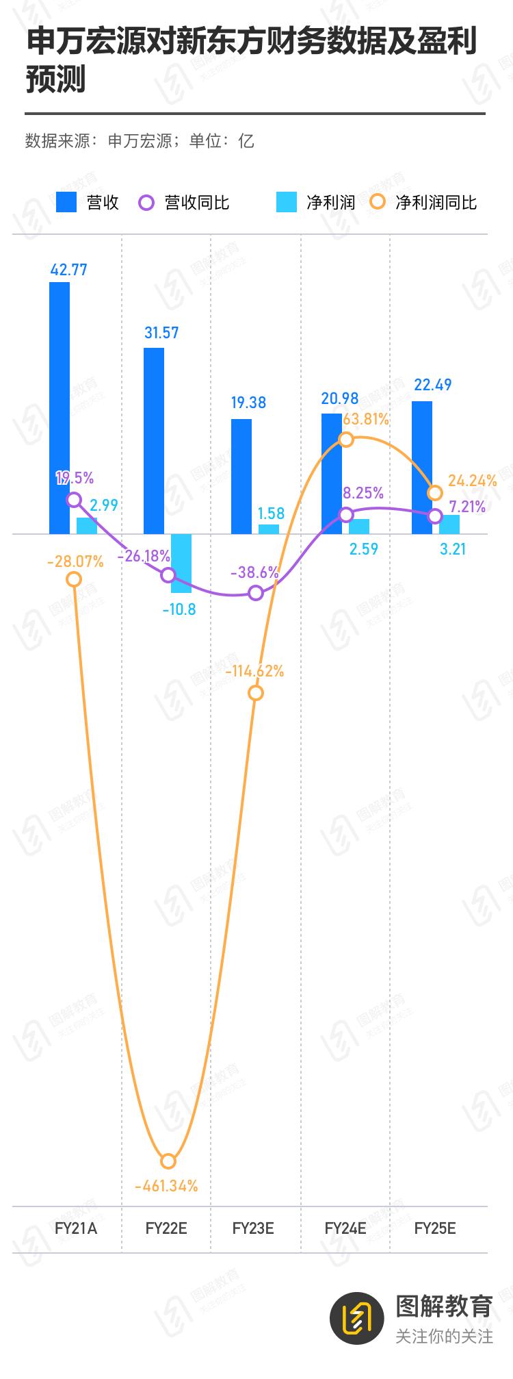 业界也颇为看好新东方,申万宏源的研报即认为,基于三大原因——(1)就业压力激发学历提升需求,留学及成人考培业务成长性凸显,(2)在留学相关业务以及考研培训业务的先发优势显著,以及(3)“双减”影响基本出清,新东方有望逐步走出困境并在23财年扭亏为盈,预计新东方目标企业价值为69.93亿美元,对应目标价为每股41.2美元,重申对于新东方的“买入”评级。