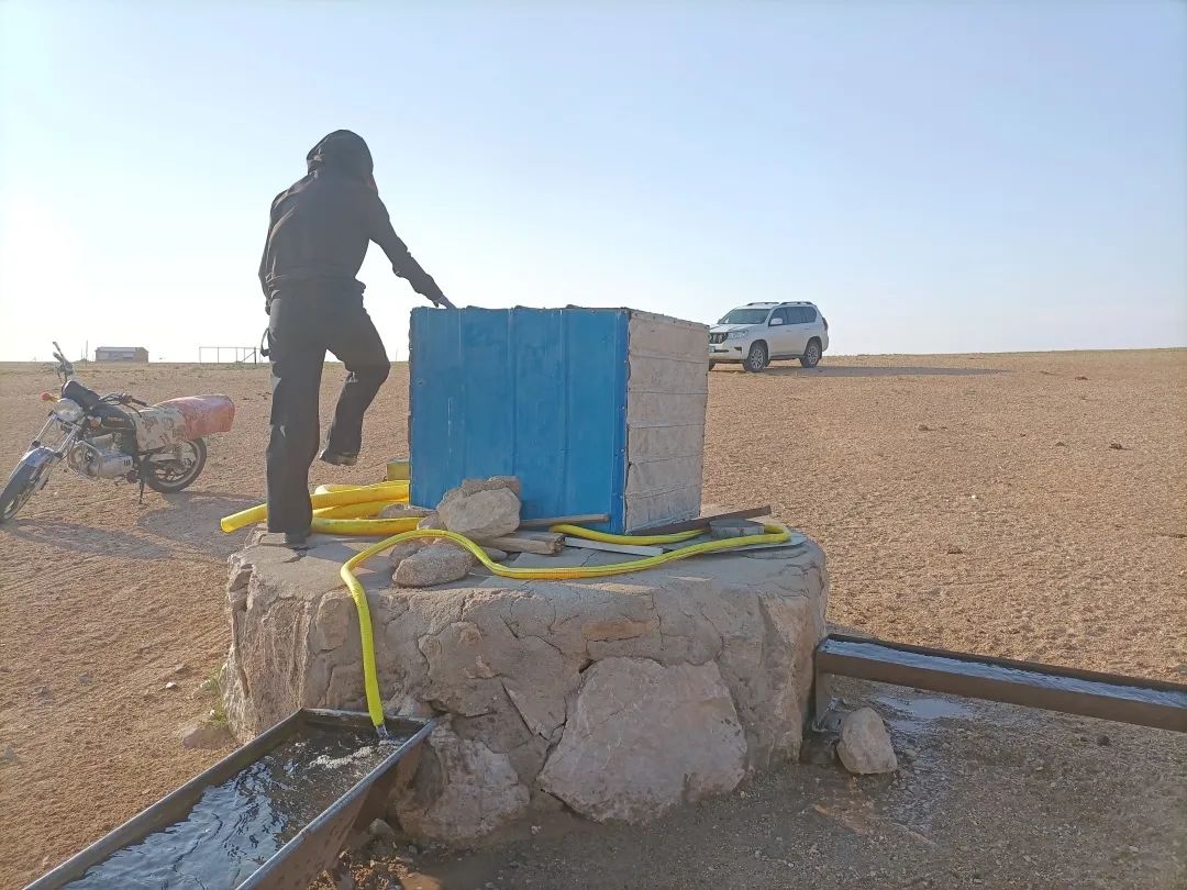 ●马大哥的女儿海日汗在井边打水。这是1990年代嘎查为牧民打的机电井。我们拜访的那天,牲畜正好在附近的草场吃草,所以饮水槽就放在井边。为了让草场得到充分的休息,每隔几天,马大哥就会换一次放牧点。如果放牧点离水井太远,就必须用水车拉水。