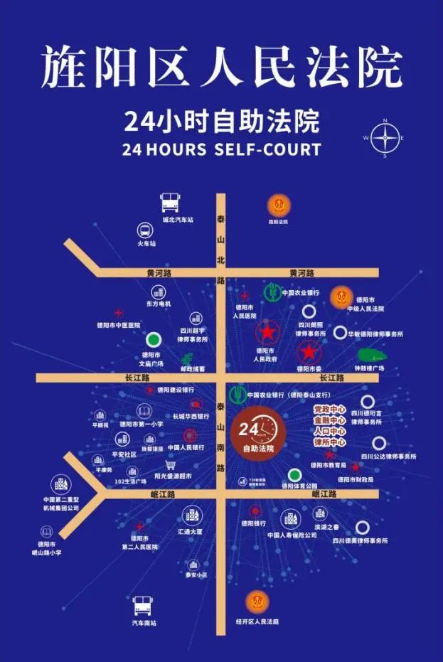 旌阳区法院“24小时自助法院”建设在旌阳区泰山南路一段25号,地处德阳党政中心、金融中心、人口中心、律所中心。